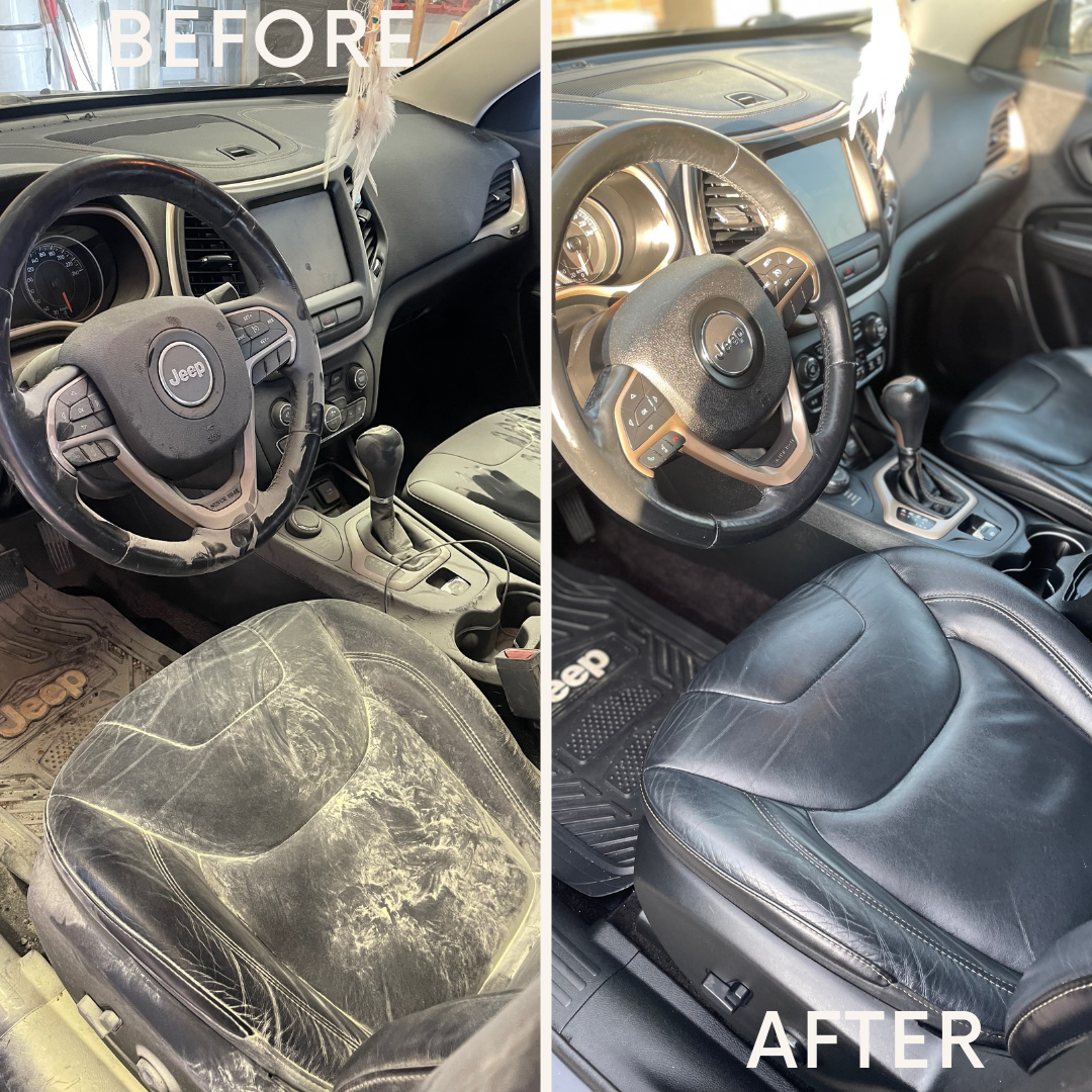 The process included full residue removal, headliner steam cleaning, deep cleaning of all surfaces, vent and crevice detailing, carpet extraction, sanitization, and leather restoration to safely reset the interior.